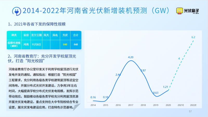 2021年11月5日河南省下發(fā)光伏保障性建設規(guī)模指標共648MW。同時,河南省教育廳提出打造“陽光校園”工程,要求充分利用各級各類學校建筑屋頂?shù)冗m宜空間場地,開展分布式光伏開發(fā)建設,力爭用3年左右時間,大幅提高學校分布式光伏發(fā)電規(guī)模。鼓勵推動各級各類學校充分利用屋頂資源開展光伏發(fā)電建設,打造特色示范基地。