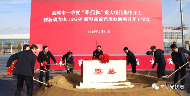 市委書(shū)記張利宣布開(kāi)工,并和出席儀式的領(lǐng)導(dǎo)嘉賓共同為項(xiàng)目培土奠基。據(jù)悉,新瑞光電12GW新型高效光伏電池項(xiàng)目總投資100億元,是高郵經(jīng)開(kāi)區(qū)有史以來(lái)首個(gè)百億元項(xiàng)目。該項(xiàng)目占地436畝,設(shè)備投資30億元,年產(chǎn)12GW高效TOPCon+HJT光伏電池。