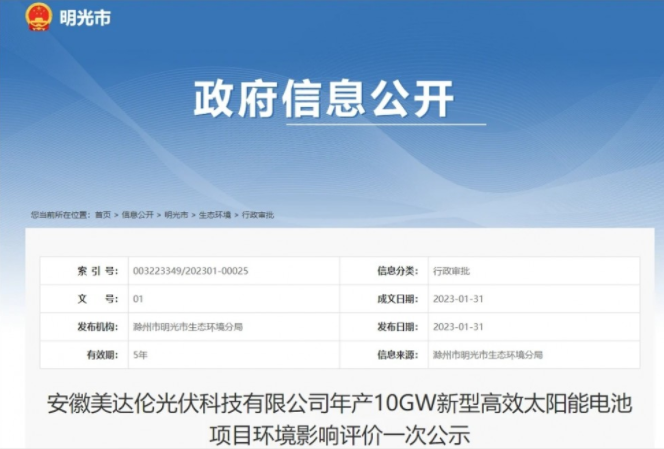 2023年1月31日,滁州市明光市生態(tài)環(huán)境分局發(fā)布了安徽美達(dá)倫光伏科技有限公司年產(chǎn)10GW新型高效太陽能電池項(xiàng)目環(huán)境影響評價一次公示,安徽省明光市產(chǎn)城新區(qū)擬建設(shè)年產(chǎn)10GW新型高效太陽能電池項(xiàng)目。