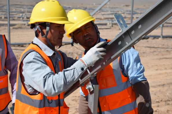 在樁基施工過(guò)程中,克服作業(yè)面環(huán)境惡劣、氣溫高紫外線強(qiáng)、常伴有沙塵暴等因素,以每日、每周為節(jié)點(diǎn)嚴(yán)格落實(shí)施工部署,優(yōu)化工序施工方案,采取測(cè)量放點(diǎn)精準(zhǔn)定位,樁位中心清晰標(biāo)識(shí),樁機(jī)安裝水平尺,專人盯控預(yù)埋件,有效避免樁位、樁身垂直度、樁長(zhǎng)、樁頂標(biāo)高、預(yù)埋件定位等工序風(fēng)險(xiǎn)點(diǎn)出現(xiàn),5月27日優(yōu)質(zhì)完成樁基混凝土澆筑,為項(xiàng)目安全快速推進(jìn)奠定了堅(jiān)實(shí)的基礎(chǔ)。8月12日,玉門(mén)40萬(wàn)千瓦光伏發(fā)電工程項(xiàng)目首批次光伏板順利安裝,項(xiàng)目正式進(jìn)入電氣安裝階段,同時(shí)開(kāi)啟了建設(shè)目標(biāo)“加速度”。10月30日項(xiàng)目提前40天順利完工。