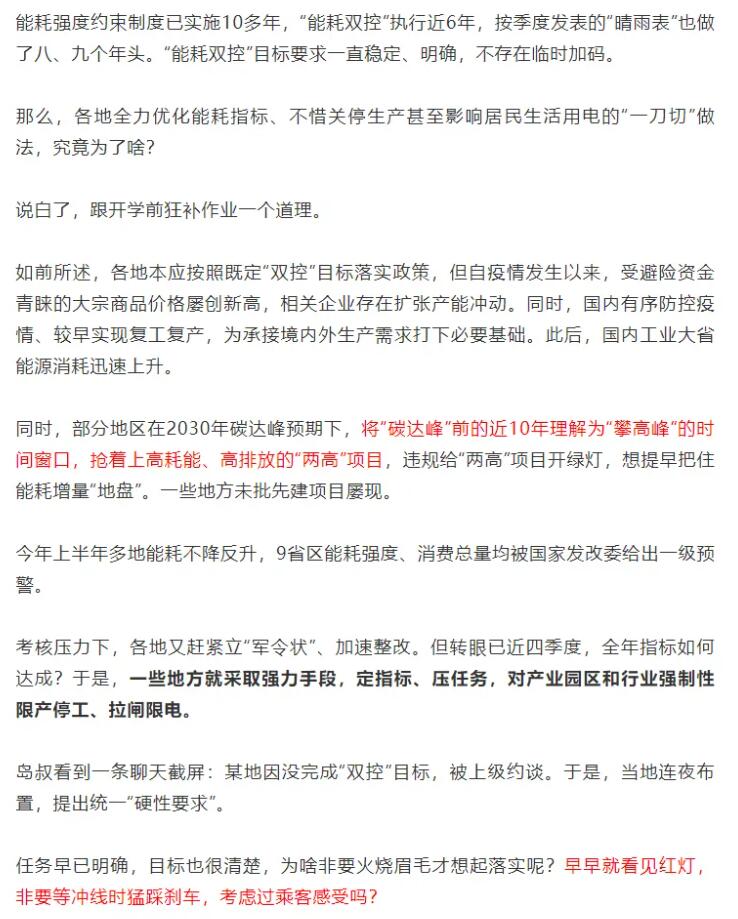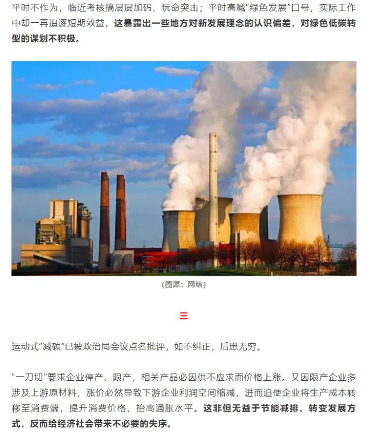 在這一政策的影響下,各地政府層層加碼,許多企業(yè)生產(chǎn)陷入停滯,甚至有部分地區(qū)居民生活用電、用水也受到影響。對此,人民日報(bào)海外版《俠客島》評論稱,平時(shí)不作為,臨近考核搞層層加碼、玩命突擊;平時(shí)高喊“綠色發(fā)展”口號,實(shí)際工作中卻一再追逐短期效益,這暴露出一些地方對新發(fā)展理念的認(rèn)識偏差,對綠色低碳轉(zhuǎn)型的謀劃不積極,“跟開學(xué)前狂補(bǔ)作業(yè)一個(gè)道理。”