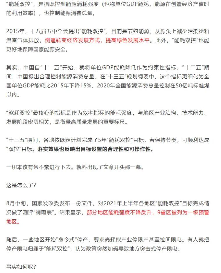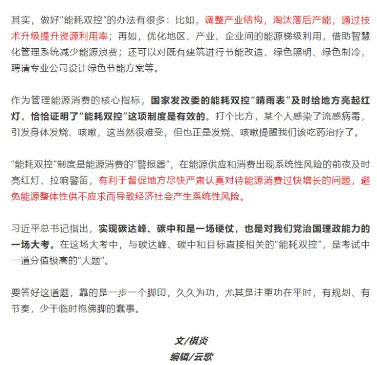 編者按:9月11日,國家發(fā)展改革委印發(fā)《完善能源消費(fèi)強(qiáng)度和總量雙控制度方案》,要求各地政府以能源資源配置更加合理、利用效率大幅提高為導(dǎo)向,以建立科學(xué)管理制度為手段,以提升基礎(chǔ)能力為支撐,強(qiáng)化和完善能耗雙控制度,深化能源生產(chǎn)和消費(fèi)革命,推進(jìn)能源總量管理、科學(xué)配置、全面節(jié)約,推動(dòng)能源清潔低碳安全高效利用,倒逼產(chǎn)業(yè)結(jié)構(gòu)、能源結(jié)構(gòu)調(diào)整,助力實(shí)現(xiàn)碳達(dá)峰、碳中和目標(biāo),促進(jìn)經(jīng)濟(jì)社會發(fā)展全面綠色轉(zhuǎn)型和生態(tài)文明建設(shè)實(shí)現(xiàn)新進(jìn)步。