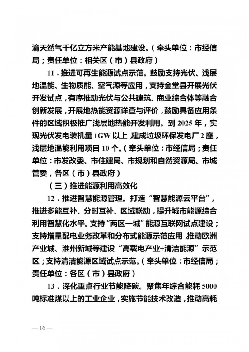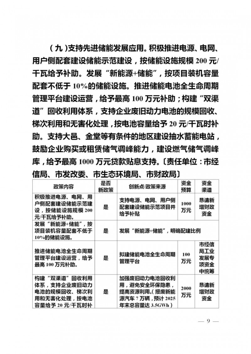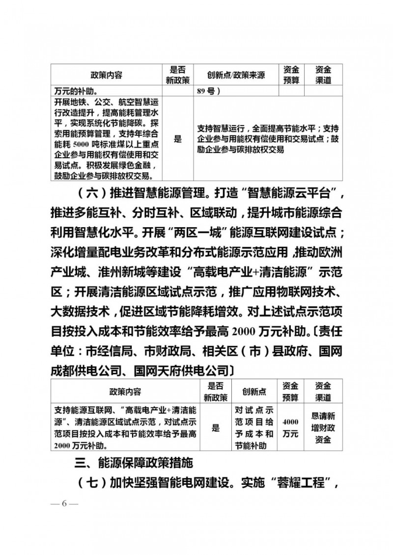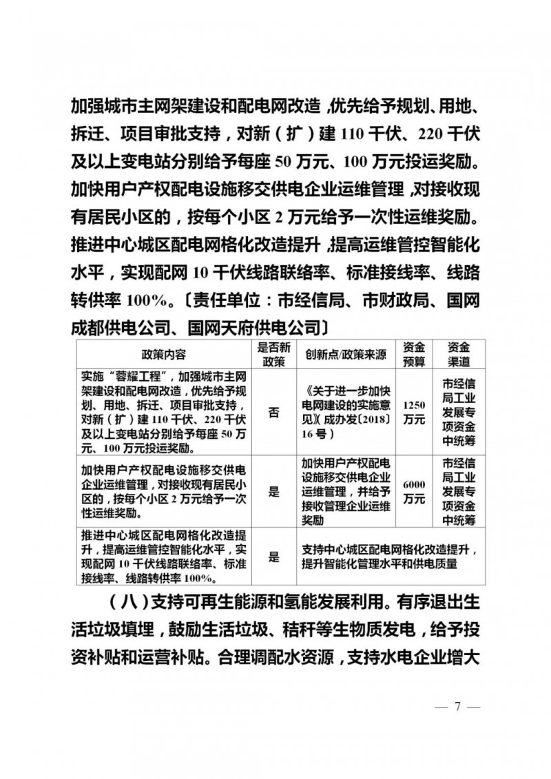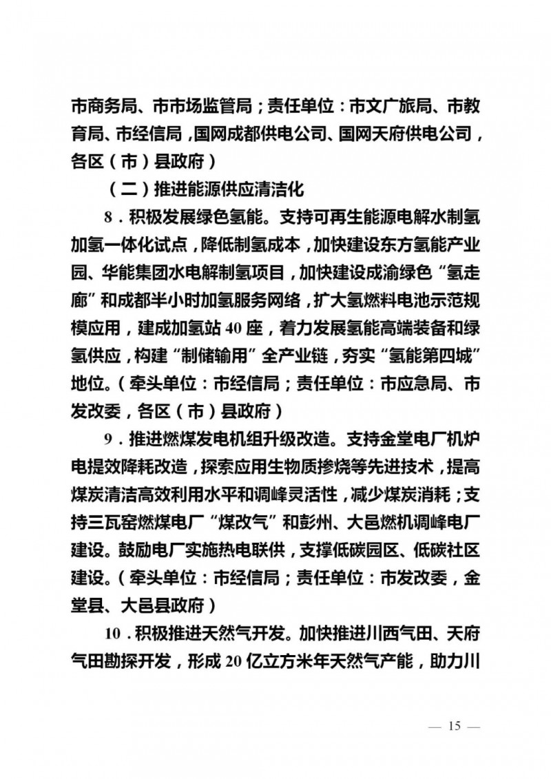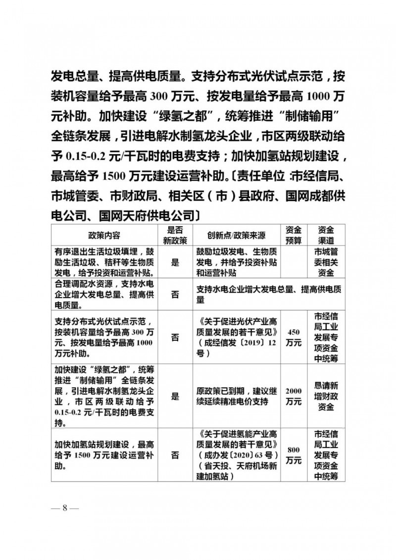 文件明確,支持可再生能源和氫能發(fā)展利用。有序退出生活垃圾填埋,鼓勵生活垃圾、秸稈等生物質發(fā)電,給予投資補貼和運營補貼。合理調配水資源,支持水電企業(yè)增大發(fā)電總量、提高供電質量。支持分布式光伏試點示范,按裝機容量給予最高300萬元、按發(fā)電量給予最高1000萬元補助。加快建設“綠氫之都”,統(tǒng)籌推進“制儲輸用”全鏈條發(fā)展,引進電解水制氫龍頭企業(yè),市區(qū)兩級聯(lián)動給予0.15-0.2元/千瓦時的電費支持;加快加氫站規(guī)劃建設,最高給予1500萬元建設運營補助。