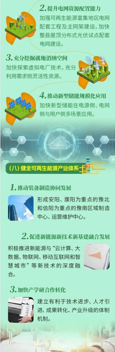 4月17日,河南發(fā)改委發(fā)布關(guān)于印發(fā)《河南省新能源和可再生能源發(fā)展“十四五”規(guī)劃》的通知。規(guī)劃明確了“十四五”期間全省發(fā)展目標(biāo),到2025年,全省再生能源消費(fèi)總量達(dá)到4700萬噸標(biāo)煤左右,占一次能源消費(fèi)總量比重16%左右;風(fēng)電光伏發(fā)電裝機(jī)、發(fā)電量比2020年“翻一番”;生物天然氣年產(chǎn)量“翻一番”;可再生能源發(fā)電量增量在全社會用電量增量中的占比超過50%;可再生能源電力總量消納責(zé)任權(quán)重達(dá)到32.2%以上,可再生能源電力非水電消納責(zé)任權(quán)重達(dá)到25.9%以上;地?zé)崮芄┡⑸镔|(zhì)供熱、生物質(zhì)燃料、太陽能熱利用等非電利用規(guī)模達(dá)到300萬噸標(biāo)準(zhǔn)煤以上。