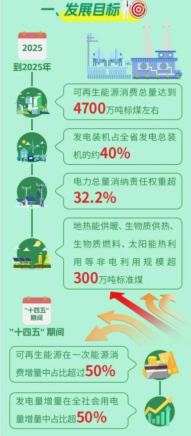 ——可再生能源發(fā)電目標(biāo)。2025年,可再生能源發(fā)電裝機(jī)達(dá)到5500萬千瓦以上,占全省發(fā)電總裝機(jī)的40%左右;可再生能源年發(fā)電量達(dá)到1000億千瓦時左右?!笆奈濉逼陂g,可再生能源發(fā)電量增量在全社會用電量增量中的占比超過50%。