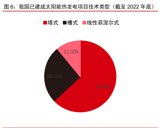 我國已建成光熱項(xiàng)目中,塔式光熱占比相對較高。根據(jù) CSTA 數(shù)據(jù),截至 2021 年底, 全球太陽能熱發(fā)電累計裝機(jī)容量達(dá)到 6.8GW,槽式、塔式、線性菲涅耳技術(shù)裝機(jī)在全球主 要國家和地區(qū)的占比為 76%、20%和 4%。截至 2022 年底,我國太陽能熱發(fā)電累計裝機(jī) 容量為 588MW(含 MW 級以上規(guī)模的發(fā)電系統(tǒng)),塔式光熱電站雖然前期系統(tǒng)建設(shè)一次性投資較大且維護(hù)成本較高,但更適合我國西部地區(qū)晝夜溫差大、缺少水資源、自然環(huán)境 惡劣等特點(diǎn),同時因槽式系統(tǒng)和線菲式系統(tǒng)集熱效率偏低、對工質(zhì)加熱能力較弱等因素, 因而在我國塔式光熱電站應(yīng)用范圍相對較廣。
