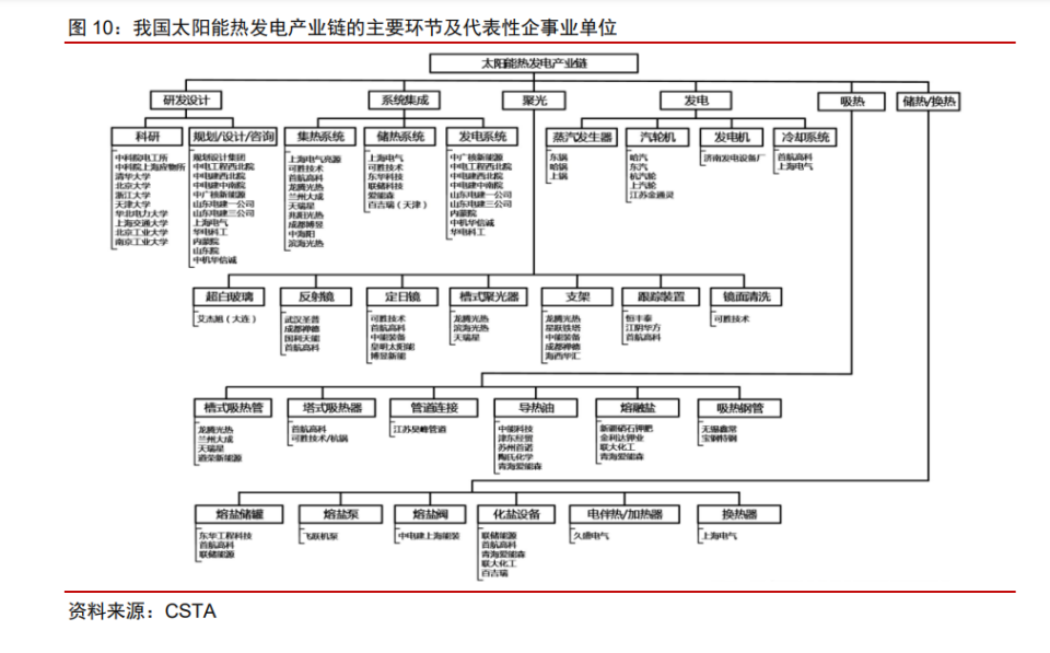 光熱發(fā)電產(chǎn)業(yè)鏈體系可分為研發(fā)、設(shè)計、制造、安裝等環(huán)節(jié),產(chǎn)業(yè)鏈國產(chǎn)化程度較高。 根據(jù) CSTA 數(shù)據(jù)顯示,在國家第一批光熱發(fā)電示范項(xiàng)目中,設(shè)備、材料國產(chǎn)化率超過 90%, 技術(shù)及裝備的可靠性和先進(jìn)性在電站投運(yùn)后得到有效驗(yàn)證;在青海中控德令哈 50MW 塔 式光熱發(fā)電項(xiàng)目中,設(shè)備和材料國產(chǎn)化率已達(dá)到 95%以上。