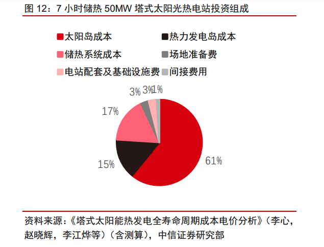 槽式太陽能熱電站中集熱場成本占比超過 50%。以我國第一個太陽能熱發(fā)電工程項(xiàng)目 內(nèi)蒙古鄂爾多斯 50MW 槽式太陽能熱發(fā)電電站為例,根據(jù)《太陽能熱發(fā)電經(jīng)濟(jì)性分析和 產(chǎn)業(yè)激勵政策建議》(杜鳳麗,謝宏)測算,項(xiàng)目一次性初投資約 14.56 億元,其中集熱 系統(tǒng)(主要包括聚光器、真空吸熱管、導(dǎo)熱油管路、輔助熱源及膨脹系統(tǒng)、就地控制器等 設(shè)備及其輔助設(shè)施和土建設(shè)施等)占整個電站建設(shè)成本的 50%,儲熱系統(tǒng)(主要包括熔 融鹽、鹽泵、就地進(jìn)程控制系統(tǒng)等設(shè)備及其相應(yīng)的輔助設(shè)施和土建設(shè)施等)成本占比 11%, 換熱系統(tǒng)(包括充熱換熱器、預(yù)熱器、蒸汽發(fā)生器以及過熱器等設(shè)備及其相應(yīng)的輔助設(shè)施 和土建設(shè)施等)成本占比 11%。