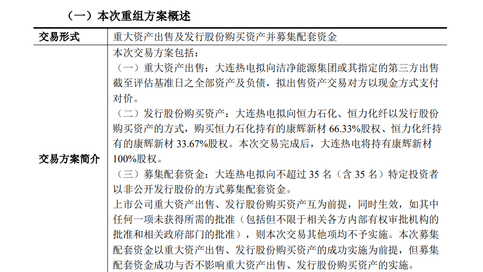 交易完成后,這將成為A股市場首例由民企上市公司主導(dǎo)的“分拆+重組”案例,可謂創(chuàng)造了歷史。目前恒力石化總市值1014億元,大連熱電總市值19.62億元,本次交易恒力石化擬通過以公司及子公司恒力化纖共同持有的康輝新材100%股權(quán)認(rèn)購大連熱電非公開發(fā)行股份等方式,實(shí)現(xiàn)全資子公司康輝新材重組上市。大連熱電擬以發(fā)行股份購買資產(chǎn)的方式,購買恒力石化持有的康輝新材66.33%股權(quán)、恒力化纖持有的康輝新材33.67%股權(quán),具體方案如下。