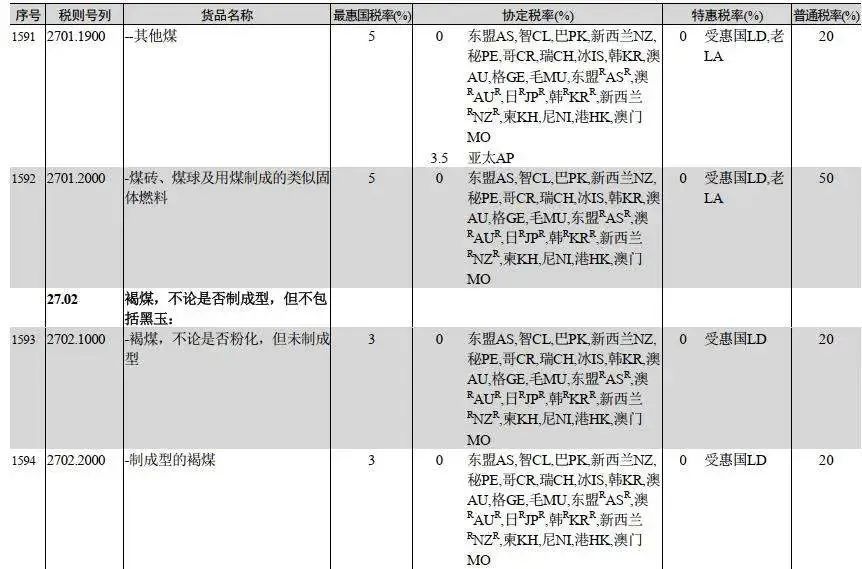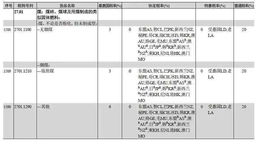 按照自貿協(xié)定,來自澳大利亞、印尼的進口煤適用的是協(xié)定稅率,均為0;來自包括俄羅斯、美國、南非、蒙古等在內的其他國家的進口煤實行最惠國稅率。