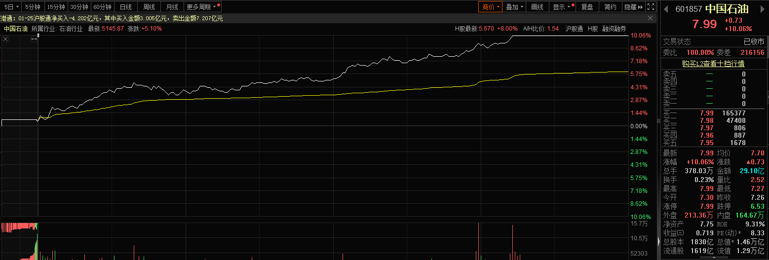 11月25日萬億巨頭中國石油實現(xiàn)漲停,為2015年7月以來首次。截至收盤,漲幅為10.06%,股價報7.99元,市值達(dá)1.46萬億,成交金額為29.10億元。