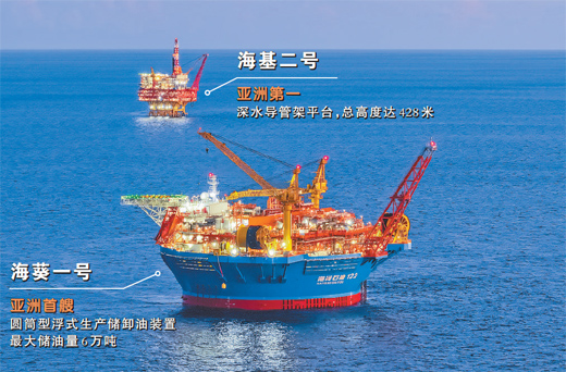 這一天,兩個“能源重器”——亞洲首艘圓筒型浮式生產儲卸油裝置(FPSO)“??惶?rdquo;、亞洲第一深水導管架平臺“?;?rdquo;攜手上崗,標志著我國全類型深水油氣裝備的設計、建造和安裝能力達到世界一流水平。