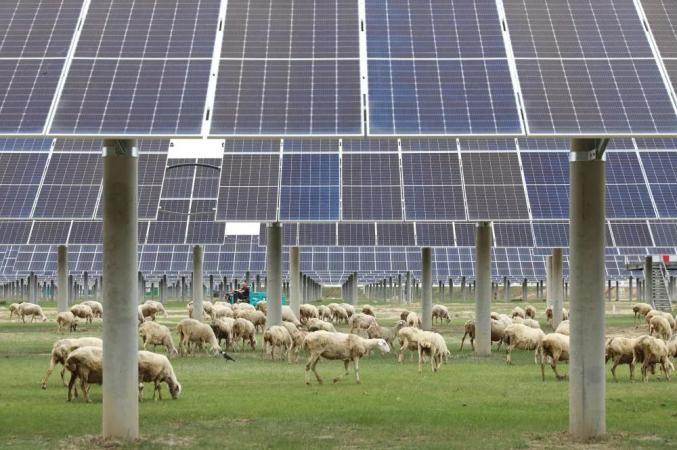 7月11日,在張家口市康保縣張紀(jì)鎮(zhèn),羊群在光伏板下覓食。新華社記者 楊世堯 攝