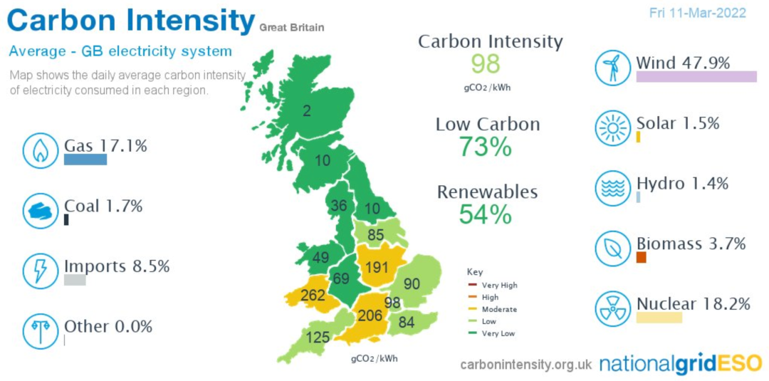 據(jù)英國國家電網(wǎng)數(shù)據(jù),2022年3月11日(星期五)風力發(fā)電占英國電力的47.9%,其次是核能18.2%,天然氣17.1%,進口電力8.5%,生物質(zhì)3.7%,煤炭1.7%,太陽能1.5%,水力1.4%。