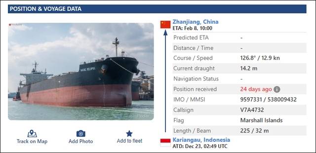 此前船舶數(shù)據(jù)顯示,裝載澳大利亞煤炭的Magic Eclipse號(hào)貨輪駛向湛江港