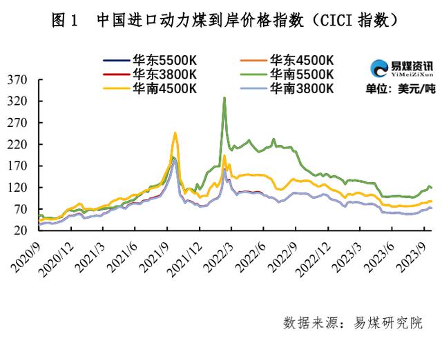 本周進(jìn)口市場(chǎng)表現(xiàn)一般,電廠采購(gòu)多以剛需為主,貿(mào)易商出貨意愿提升,投標(biāo)價(jià)格變化不大,中標(biāo)價(jià)格基本維穩(wěn)。就貿(mào)易商而言,受巴以沖突影響,海外能源價(jià)格走強(qiáng),海外煤價(jià)相對(duì)堅(jiān)挺,雖然印尼供應(yīng)有所好轉(zhuǎn),但礦方降價(jià)意愿依舊不高,所以印尼煤采購(gòu)成本依舊較高,進(jìn)口貿(mào)易商報(bào)價(jià)較為堅(jiān)挺,但投標(biāo)積極性提升;就下游終端而言,雖然沿海電廠庫(kù)存環(huán)比下滑,但依舊位于歷史高位,隨著氣溫回落,日耗低位震蕩,電廠采購(gòu)意愿不高,大部分電廠已經(jīng)采購(gòu)11月底貨物,預(yù)計(jì)電廠過(guò)冬壓力不大。印尼煤Nar3800K的11月貨盤(pán)FOB中標(biāo)價(jià)至大概為62-65美元/噸,澳煤Nar5500K報(bào)價(jià)回落至104-106美元/噸。