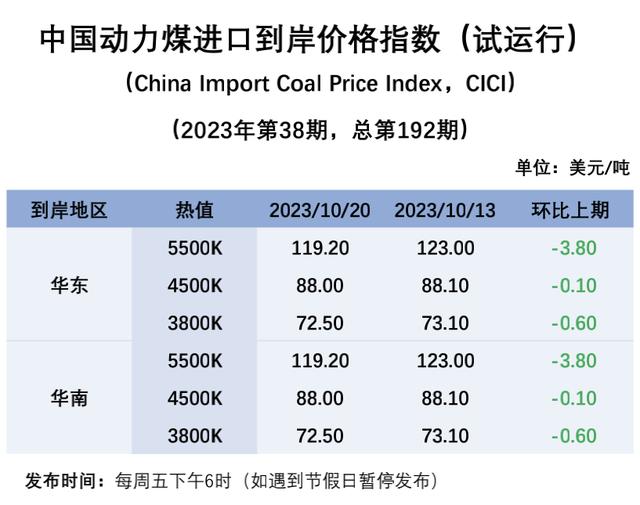 截至10月20日,5500K華東和華南到岸價(jià)均為119.20美元/噸,較上期下跌3.80美元/噸,較國(guó)內(nèi)煤價(jià)低20-25元/噸;4500K華東和華南到岸價(jià)均為88.00美元/噸,較上期下跌0.10美元/噸,與國(guó)內(nèi)煤價(jià)低20-25元/噸;3800K華東和華南到岸價(jià)均為72.50美元/噸,較上期下跌0.60美元/噸,較國(guó)內(nèi)煤價(jià)低10-15元/噸。(理論測(cè)算,僅供參考)。