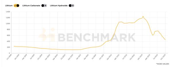 從2018年10月至今的基準鋰價格指數(shù)(按市場交易量加權(quán)) 來源:Benchmark Mineral Intelligence
