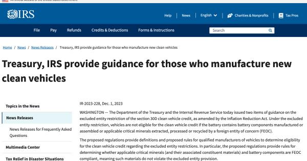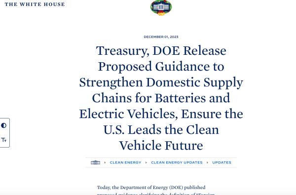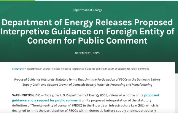 12月1日,美國能源部(DOE)發(fā)布《兩黨基礎(chǔ)設(shè)施法》中 “敏感外國實(shí)體(Foreign Entity of Concern,F(xiàn)EOC)”的解釋文件。同日,美國財(cái)政部(Treasury)和國稅局(IRS)發(fā)布了《通貨膨脹削減法》(IRA)第30D條清潔能源車輛稅收抵免相關(guān)禁令的指導(dǎo)意見。