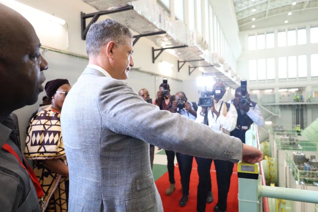 若昂·博爾熱斯為項目落成剪彩典禮結(jié)束后,若昂·博爾熱斯一行參觀了電站相關(guān)設(shè)施,并對電站的現(xiàn)代化設(shè)備、先進(jìn)技術(shù)和運維能力給予高度肯定。在機(jī)房,若昂·博爾熱斯按下發(fā)電機(jī)組運行總按鈕,正式啟動項目發(fā)電。