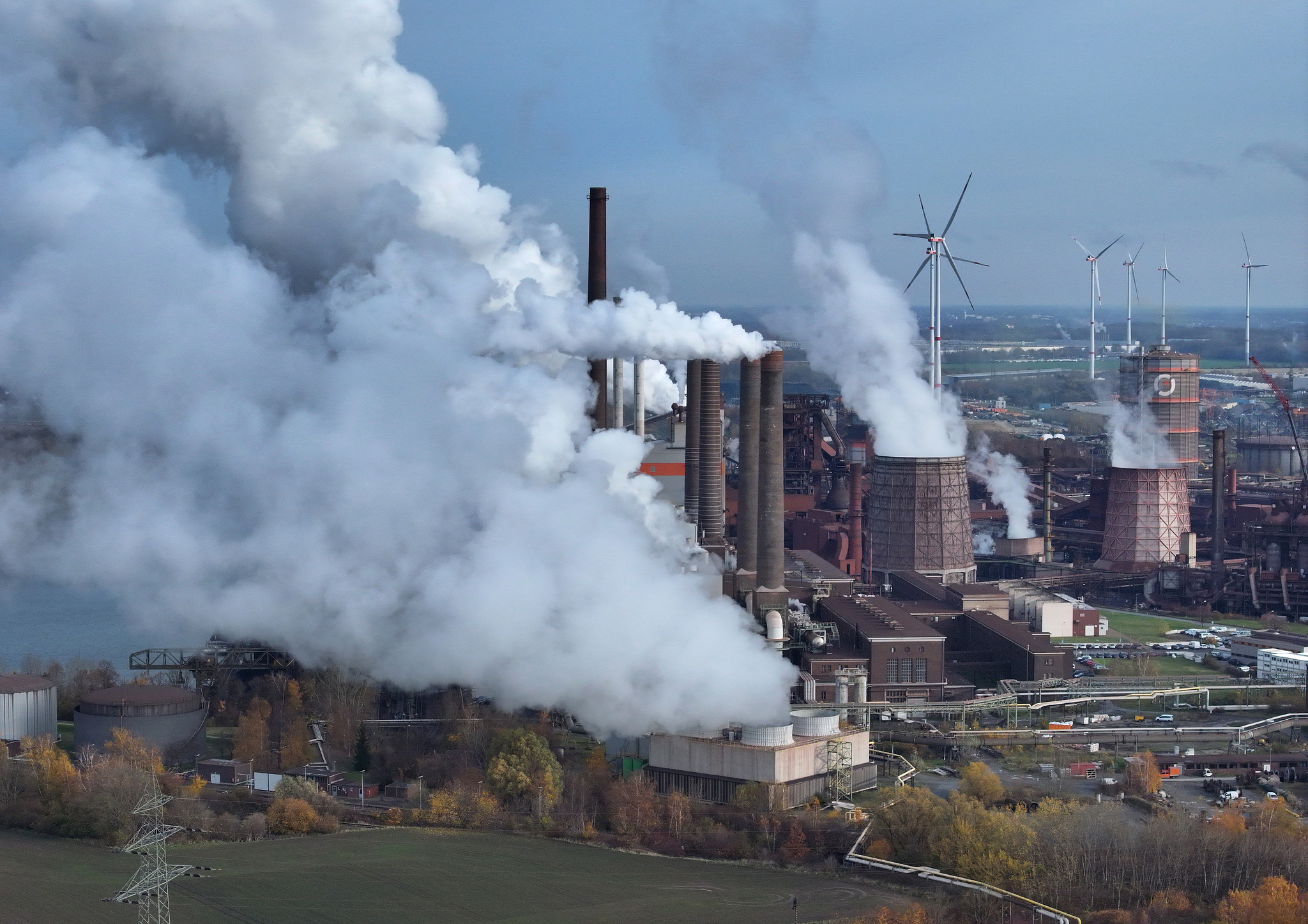 德國薩爾茨吉特鋼鐵公司工廠的鋼煙囪排放出大量水蒸氣和廢氣。