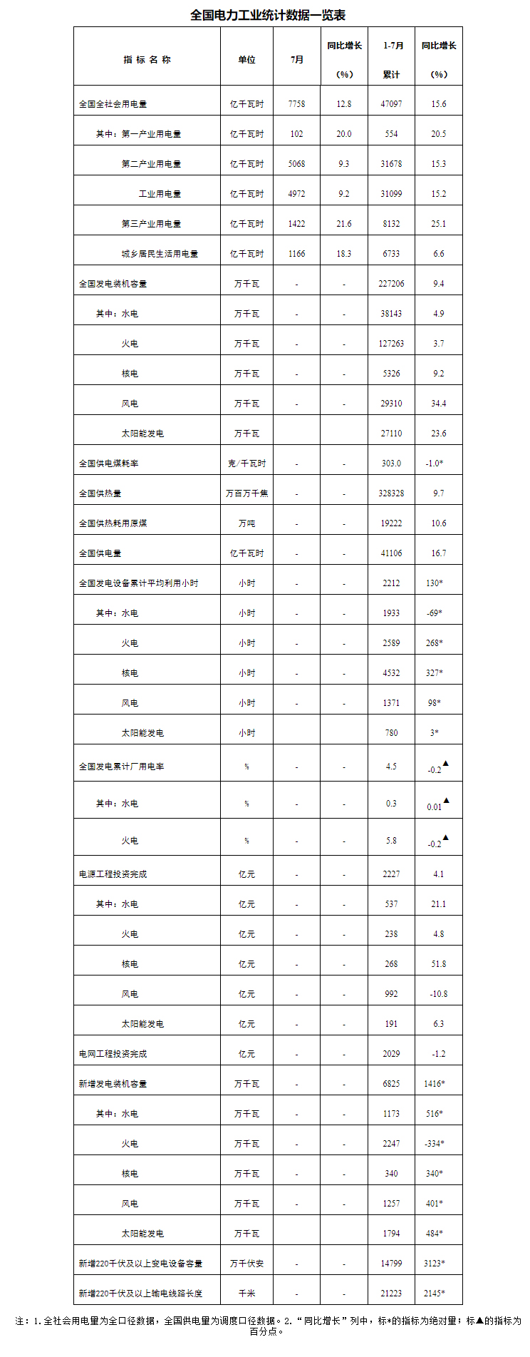 8月17日,國家能源局發(fā)布1-7月份全國電力工業(yè)統(tǒng)計數(shù)據(jù)。截至7月底,全國發(fā)電裝機(jī)容量22.7億千瓦,同比增長9.4%。其中,風(fēng)電裝機(jī)容量2.9億千瓦,同比增長34.4%。太陽能發(fā)電裝機(jī)容量2.7億千瓦,同比增長23.6%。