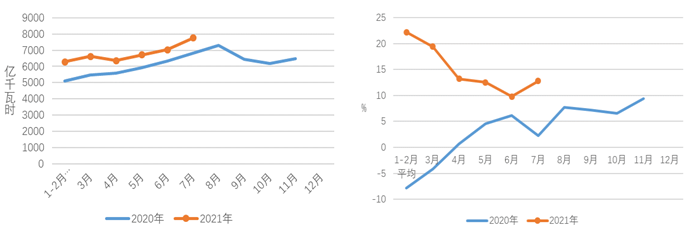 1-7月份,全國工業(yè)用電量同比增長15.2%,增速同比提高17.4個百分點。全國制造業(yè)用電量同比增長16.8%,增速同比提高18.7個百分點。制造業(yè)中,四大高載能行業(yè)合計用電量同比增長12.5%,其中,建材行業(yè)同比增長17.1%,黑色行業(yè)同比增長14.5%,化工行業(yè)同比增長11.4%,有色行業(yè)用電量同比增長9.0%;高技術(shù)及裝備制造業(yè)合計用電同比增長24.7%,其中,電氣機械和器材制造業(yè)、汽車制造業(yè)、儀器儀表制造業(yè)、通用設(shè)備制造業(yè)、計算機/通信和其他電子設(shè)備制造業(yè)、專用設(shè)備制造業(yè)、金屬制品業(yè)同比增長超過20%,分別為33.3%、29.9%、28.9%、27.5%、27.1%、22.0%和20.3%;消費品制造業(yè)合計用電同比增長20.3%,其中,家具制造業(yè)、文教/工美/體育和娛樂用品制造業(yè)、紡織服裝/服飾業(yè)、木材加工和木/竹/藤/棕/草制品業(yè)、皮革/毛皮/羽毛及其制品和制鞋業(yè)、紡織業(yè)、印刷和記錄媒介復(fù)制業(yè)同比增長超過20%,分別為31.4%、27.4%、27.3%、26.3%、25.4%、25.3%和21.3%。