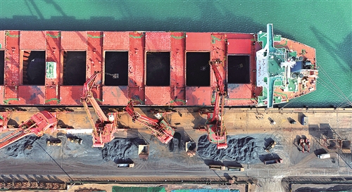 10月23日,一艘電煤船舶在江蘇連云港港煤炭碼頭卸載煤炭。