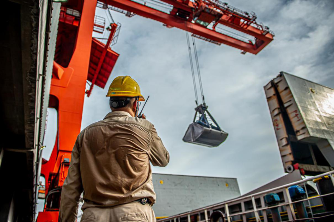 江蘇泰州電廠員工指揮裝卸航運(yùn)機(jī)組燃煤 李俊 攝