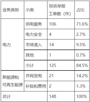 2022年9月份工單中,投訴和舉報(bào)類(lèi)工單共148件,同比增加54.2%,環(huán)比減少31.5%。從反映內(nèi)容看,電力類(lèi)125件,占84.5%,新能源和可再生能源類(lèi)23件。具體情況見(jiàn)表6。