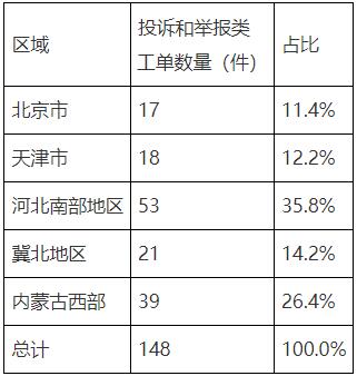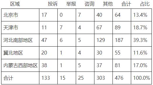 9月份投訴和舉報(bào)工單中,河北南部地區(qū)數(shù)量最多,占35.8%。投訴和舉報(bào)類(lèi)工單按區(qū)域分布情況具體見(jiàn)表7。