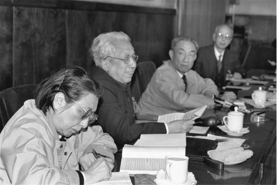 1992年3月26日,錢正英(左一)正認真聽取七屆全國人大五次會議四川代表團代表對三峽工程議案的意見。