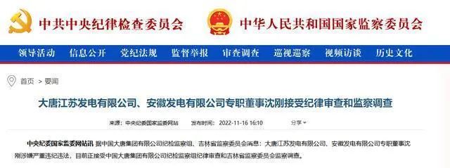 據(jù)中國大唐集團有限公司紀檢監(jiān)察組、吉林省監(jiān)察委員會消息:大唐江蘇發(fā)電有限公司、安徽發(fā)電有限公司專職董事沈剛涉嫌嚴重違紀違法,目前正接受中國大唐集團有限公司紀檢監(jiān)察組紀律審查和吉林省監(jiān)察委員會監(jiān)察調(diào)查。