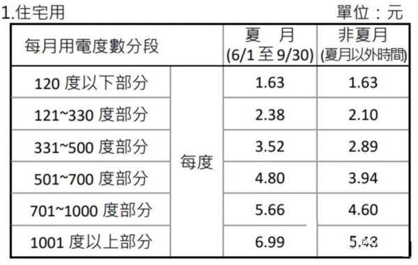 一般家庭由于用電量較少且低谷時(shí)段(22:30-07:30)用電量不多,故多采用階梯電價(jià)計(jì)費(fèi)。以夏月為例,假設(shè)每月用電433度,其中的120度每度電價(jià)為1.63元新臺(tái)幣(與非夏月單價(jià)一致),121度-330度部分對(duì)應(yīng)每度2.38元新臺(tái)幣,剩余103度對(duì)應(yīng)3.52元新臺(tái)幣,逐級(jí)增加。簡(jiǎn)言之,用電量越大、單價(jià)越高。