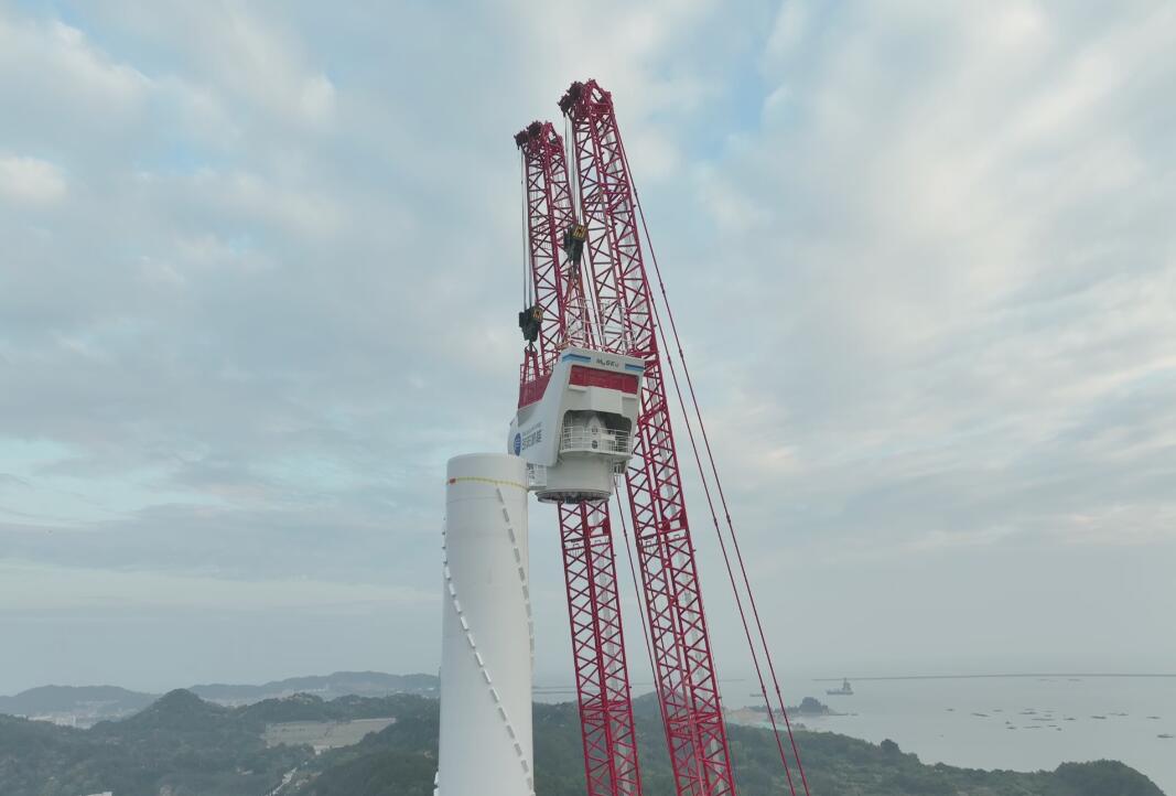 廣東首個(gè)風(fēng)電臨海試驗(yàn)基地試驗(yàn)風(fēng)機(jī)吊裝。