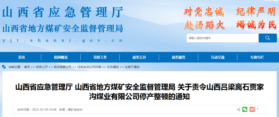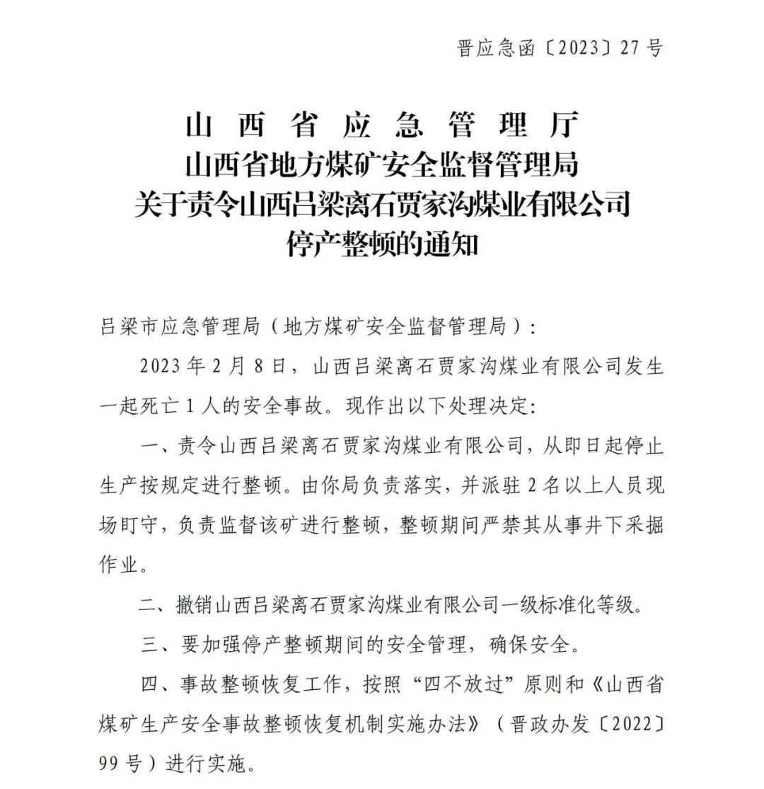 2月9日,山西省應(yīng)急管理廳、山西省地方煤礦安全監(jiān)督管理局下發(fā)通知,責令山西呂梁離石賈家溝煤業(yè)有限公司停產(chǎn)整頓。