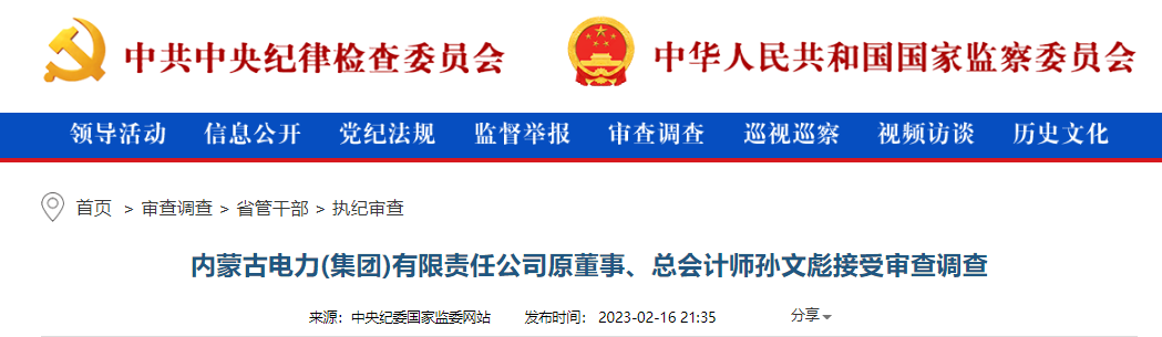 中央紀(jì)委國(guó)家監(jiān)委網(wǎng)站2月16日消息,據(jù)內(nèi)蒙古自治區(qū)紀(jì)委監(jiān)委消息:內(nèi)蒙古電力(集團(tuán))有限責(zé)任公司原董事、總會(huì)計(jì)師孫文彪涉嫌嚴(yán)重違紀(jì)違法,目前正接受內(nèi)蒙古自治區(qū)紀(jì)委監(jiān)委紀(jì)律審查和監(jiān)察調(diào)查。