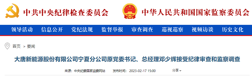中央紀(jì)委國(guó)家監(jiān)委網(wǎng)站2月17日消息,據(jù)中國(guó)大唐集團(tuán)有限公司紀(jì)檢監(jiān)察組、寧夏回族自治區(qū)監(jiān)察委員會(huì)消息:大唐新能源股份有限公司寧夏分公司原黨委書記、總經(jīng)理鄧少輝涉嫌嚴(yán)重違紀(jì)違法,目前正接受中國(guó)大唐集團(tuán)有限公司紀(jì)檢監(jiān)察組紀(jì)律審查和寧夏回族自治區(qū)銀川市監(jiān)察委員會(huì)監(jiān)察調(diào)查。