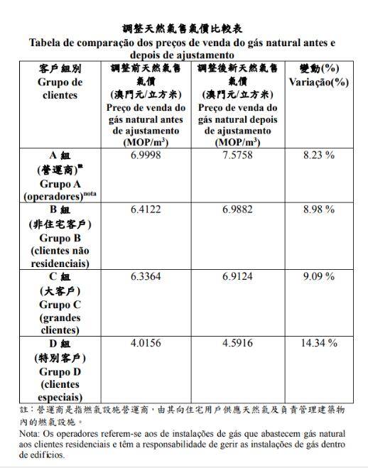 四個(gè)客戶組別的天然氣售氣價(jià)格將分別上調(diào)約8%至14%(詳見附表),其中住宅客戶(A組)為主要的天然氣用戶,預(yù)計(jì)每月平均用氣費(fèi)將增加約澳門元7.5元。