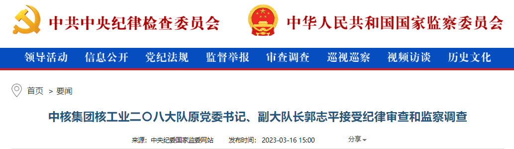 中央紀(jì)委國(guó)家監(jiān)委網(wǎng)站3月16日消息,中核集團(tuán)核工業(yè)二〇八大隊(duì)原黨委書記、副大隊(duì)長(zhǎng)郭志平涉嫌嚴(yán)重違紀(jì)違法,目前正接受中核集團(tuán)紀(jì)檢監(jiān)察組和內(nèi)蒙古自治區(qū)烏海市監(jiān)委紀(jì)律審查和監(jiān)察調(diào)查。