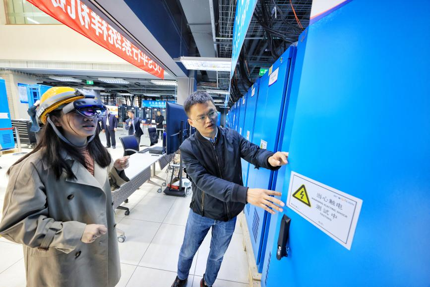 “各位在電視屏幕里看到的,就是在機(jī)柜門沒開的情況下,我們工作人員通過智能頭盔眼鏡看到的機(jī)柜內(nèi)畫面。”