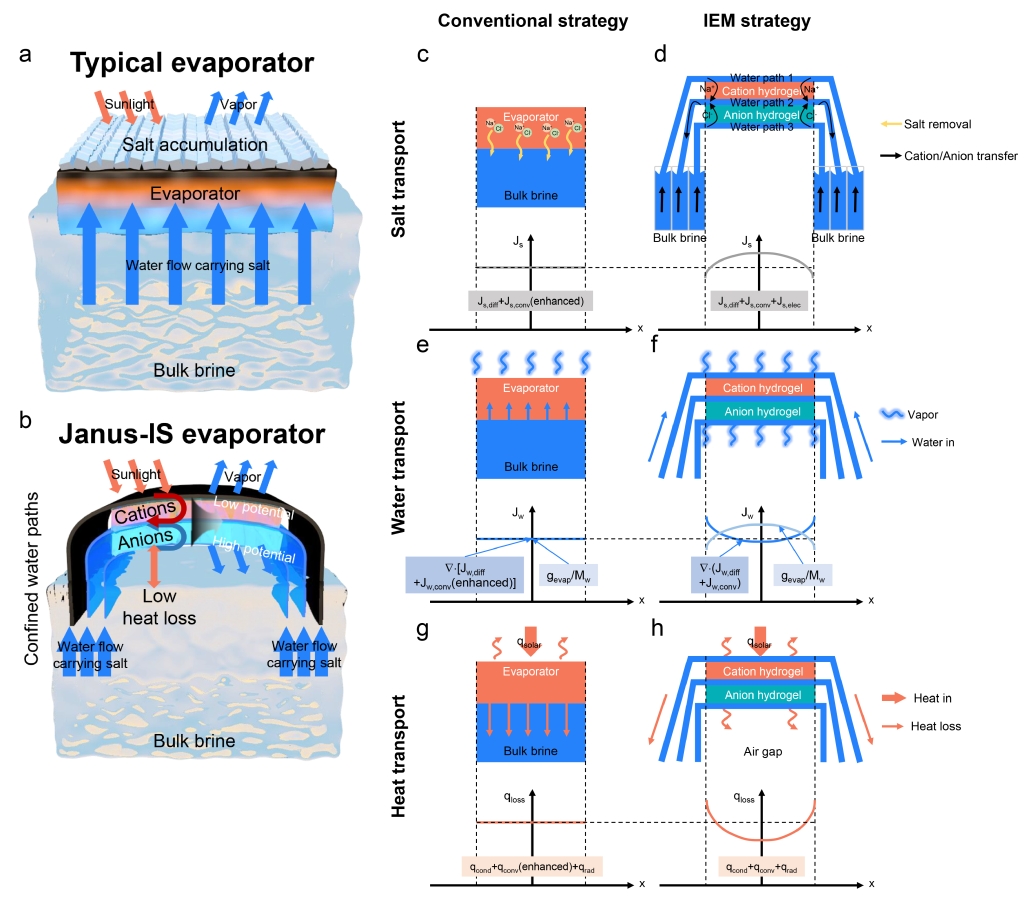 太陽能界面蒸發(fā)是一種新興的海水淡化技術(shù),其將蒸發(fā)器漂浮于海面上進(jìn)行界面光熱蒸發(fā),具有綠色、零能耗、低成本和結(jié)構(gòu)簡單等諸多優(yōu)勢,有望解決全球性淡水短缺問題。但光熱表面水汽化會(huì)造成鹽分積累,嚴(yán)重阻礙其長期運(yùn)行的穩(wěn)定性。將光熱層疏水化和強(qiáng)化對流傳質(zhì)是當(dāng)前抗積鹽的主要方法。前者避免海水到達(dá)光熱層來防止積鹽,但其同時(shí)增大了光熱層與海水之間的熱阻,降低蒸發(fā)速率。后者加快水對流從蒸發(fā)表面帶走鹽分,但同時(shí)也帶走了熱量,制約蒸發(fā)速率。因此,傳統(tǒng)方法無法解決鹽離子運(yùn)移和高效熱利用之間的矛盾,積鹽問題仍是界面蒸發(fā)所面臨的最嚴(yán)峻挑戰(zhàn)之一。