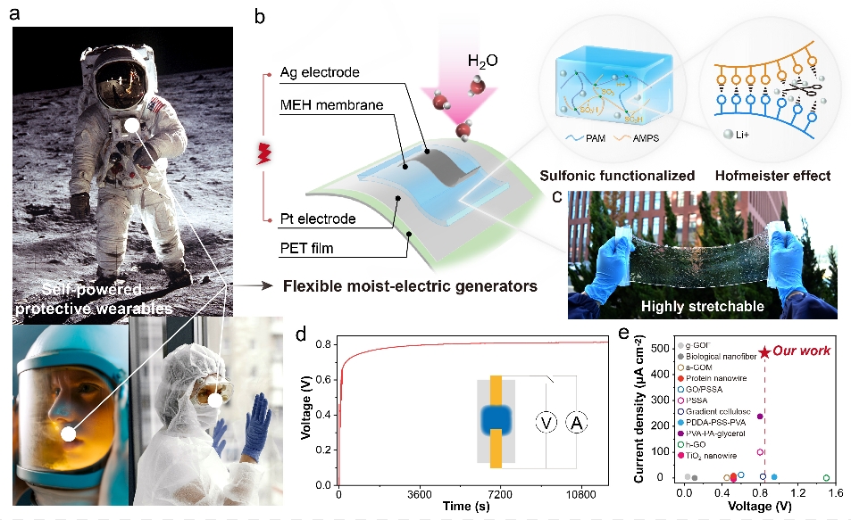 為解決上述問題,該團(tuán)隊(duì)聚焦于水凝膠聚合物材料,其不僅擁有良好的柔韌性,而且內(nèi)部具有大量的微納結(jié)構(gòu)和官能團(tuán),可吸附并儲存大量水分。然而,這種柔性材料的離子傳導(dǎo)率較差,難以直接用于濕電轉(zhuǎn)化。為此,該團(tuán)隊(duì)提出了一種水凝膠分子工程策略,通過在其單個(gè)聚合鏈分子結(jié)構(gòu)上進(jìn)行微觀設(shè)計(jì),顯著提高了水凝膠的離子傳導(dǎo)特性和可拉伸性。該分子工程策略是將磺酸基團(tuán)和鋰離子嵌入到聚合鏈分子結(jié)構(gòu)中。其中,磺酸基團(tuán)賦予聚合鏈更穩(wěn)健的分子結(jié)構(gòu)及電離特性,而鋰離子能夠誘導(dǎo)產(chǎn)生霍夫邁斯特效應(yīng),拓寬聚合鏈之間的間距并構(gòu)建出大量的離子傳輸通道?;诜肿庸こ趟z構(gòu)建的濕氣發(fā)電器獲得了高達(dá)480 μA cm-2的短路電流密度,是大多數(shù)已報(bào)道的濕氣發(fā)電器的十倍以上。同時(shí),其可承受500%以上的拉伸形變而不被破壞,是目前已報(bào)道的濕電轉(zhuǎn)化材料的最高水平。該濕氣發(fā)電器能夠?qū)⑷梭w呼吸過程中產(chǎn)生的濕氣轉(zhuǎn)化為電能,為電子設(shè)備提供動(dòng)力。該工作推動(dòng)了濕氣發(fā)電技術(shù)向可穿戴電子設(shè)備的應(yīng)用。