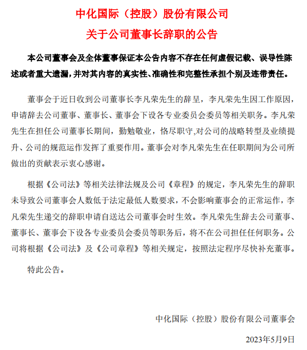 5月9日,中化國際(控股)股份有限公司(以下簡稱“中化國際”)發(fā)布公告,董事會于近日收到公司董事長李凡榮的辭呈,李凡榮因工作原因,申請辭去公司董事、董事長、董事會下設(shè)各專業(yè)委員會委員等相關(guān)職務(wù)。