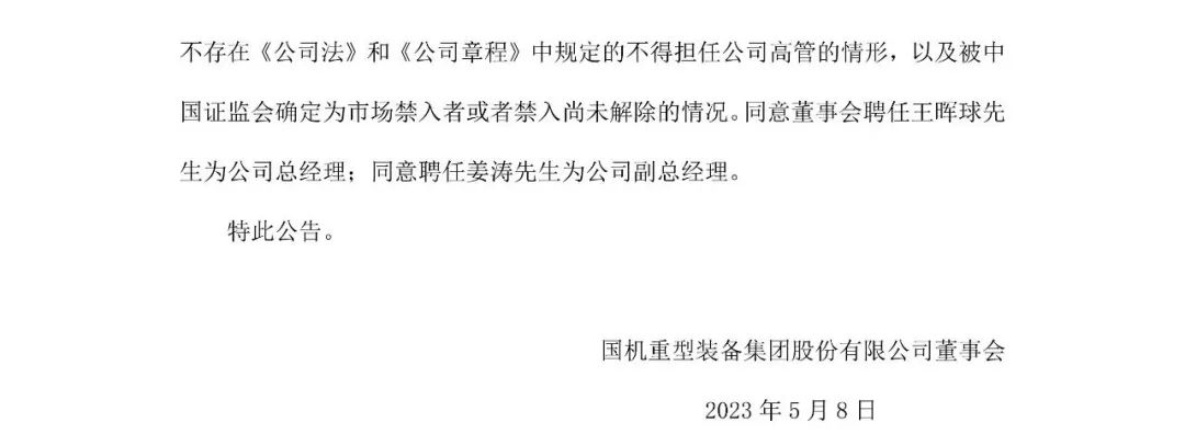5月6日,國(guó)機(jī)重裝董事會(huì)審議通過(guò)了《關(guān)于聘任公司總經(jīng)理、副總經(jīng)理的議案》,同意聘任王暉球?yàn)楣究偨?jīng)理;同意聘任姜濤為公司副總經(jīng)理。