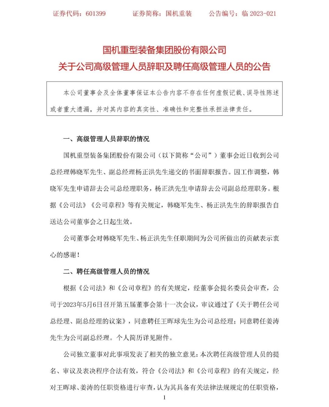 5月8日,國(guó)機(jī)重裝發(fā)布公告,董事會(huì)近日收到公司總經(jīng)理韓曉軍、副總經(jīng)理?xiàng)钫檫f交的書面辭職報(bào)告。因工作調(diào)整,韓曉軍申請(qǐng)辭去公司總經(jīng)理職務(wù),楊正洪申請(qǐng)辭去公司副總經(jīng)理職務(wù)。