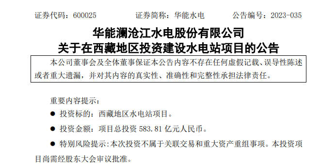 華能水電5月30日晚間公告,公司擬在西藏地區(qū)投資建設(shè)水電站項(xiàng)目,項(xiàng)目裝機(jī)容量260萬千瓦,多年平均發(fā)電量112.81億千瓦時(shí),工程總工期132個(gè)月(不含籌建期),按2022年三季度價(jià)格水平計(jì)算,工程總投資583.81億元。