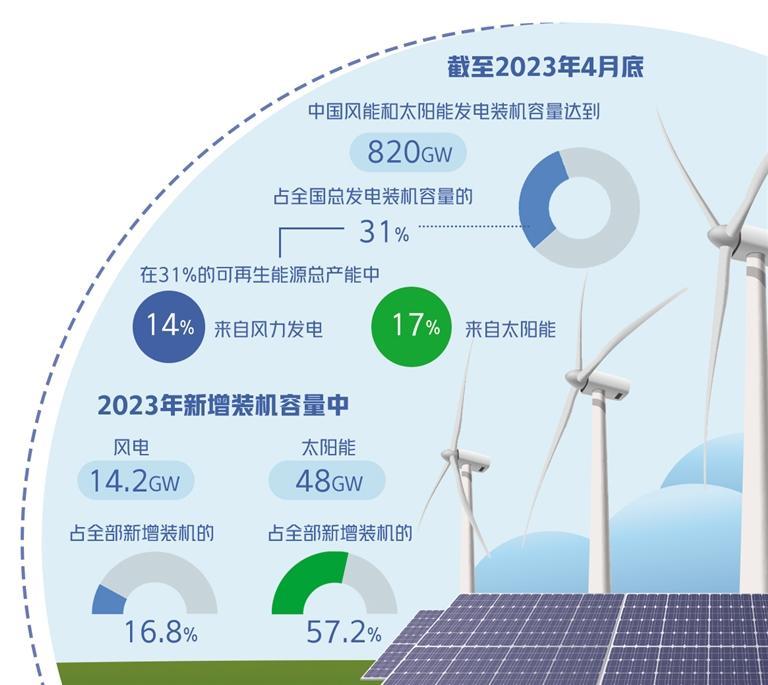 數(shù)據(jù)顯示,截至2023年4月底,中國(guó)風(fēng)能和太陽(yáng)能發(fā)電裝機(jī)容量達(dá)到820吉瓦(GW),占全國(guó)總發(fā)電裝機(jī)容量的31%。在31%的可再生能源總產(chǎn)能中,14%來(lái)自風(fēng)力發(fā)電,17%來(lái)自太陽(yáng)能。2023年新增裝機(jī)容量中,風(fēng)電14.2GW,太陽(yáng)能48GW,分別占全部新增裝機(jī)的16.8%和57.2%。這意味著可再生能源裝機(jī)容量同比增長(zhǎng)11.5%。