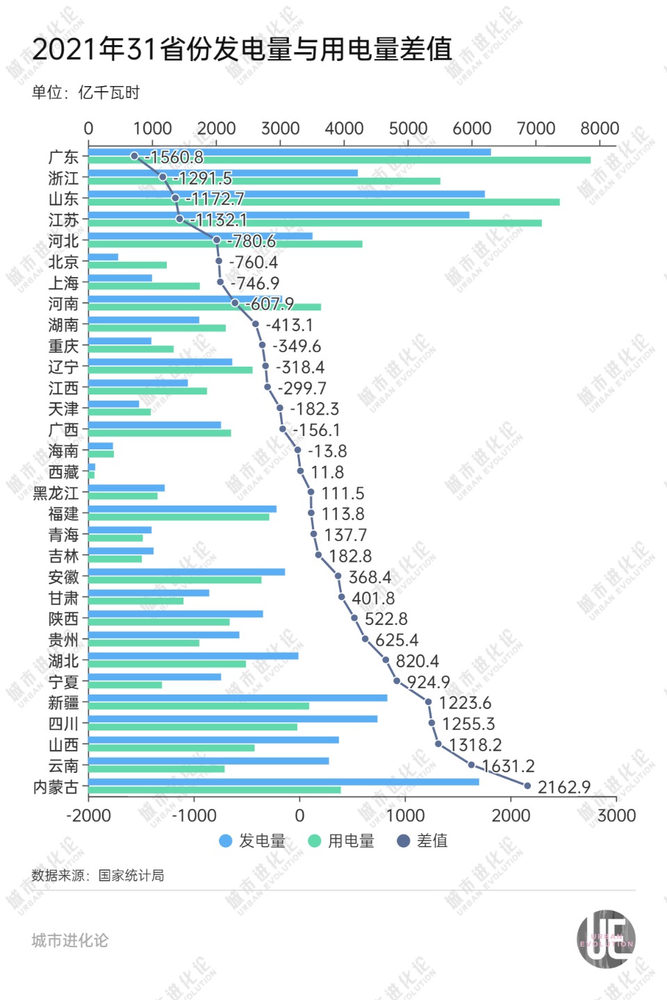 若以“發(fā)電量-用電量”來評估各省份發(fā)電凈貢獻和電力缺口,2022年,山東的差值為-1836.4億千瓦時,凈貢獻從前一年全國倒數(shù)第三跌至倒數(shù)第一。