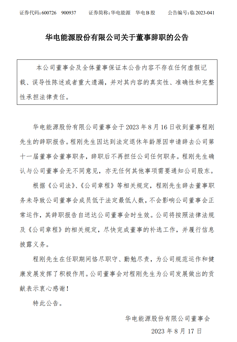 華電能源發(fā)布公告稱,公司董事會(huì)于8月16日收到董事程剛先生的辭職報(bào)告。程剛先生因達(dá)到法定退休年齡原因申請辭去公司第十一屆董事會(huì)董事職務(wù),辭職后不再擔(dān)任公司任何職務(wù)。